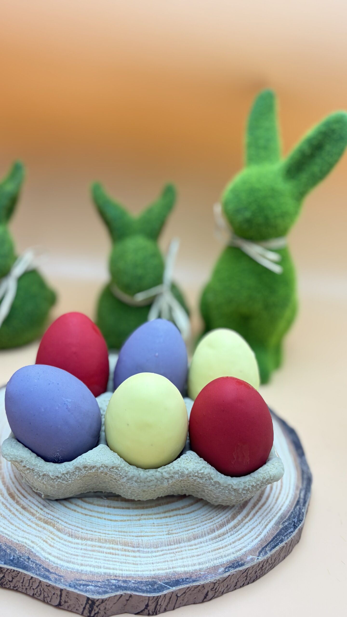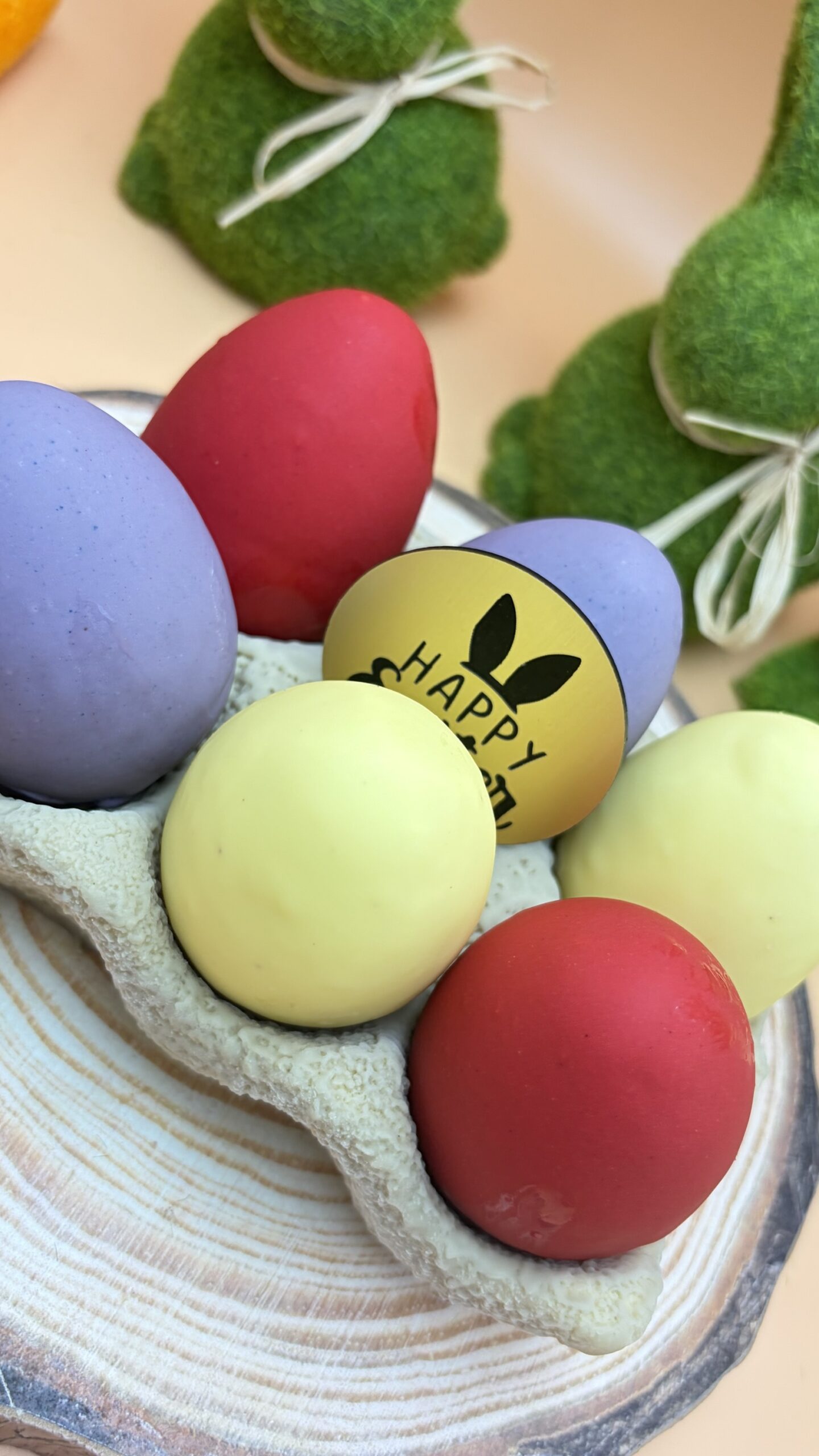 Ouă de Paște cu gălbenuș din piure ananas și albuș din moussecu piure cocos ,coajă fiind din ciocolată colorată și unt cacao!